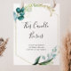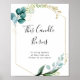 Este sinal de velas florais tropicais verdes dourados é perfeito para um casamento de destino. O design apresenta principalmente folhagens verdes pintadas à mão em aquarela, juntamente com flores douradas, adornando uma moldura geométrica elegante.