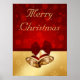Ilustração de Natal elegante e única, com 2 sinos de Natal de ouro com arco vermelho e fita em diferentes planos: fundo vermelho de um boque e fundo ouro de flocos de neve.