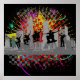 Uma ilustração de um horizonte urbano em cinza e uma figura em um skate fazendo uma pirueta aérea em frente com um fundo cinza colorido.