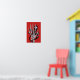 Poster de mão de esqueleto com uma ilustração gráfica de uma mão de um esqueleto com fantasmas pretos, com olhos brilhantes a girar à volta sobre um fundo vermelho vulgar.