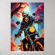 Um esqueleto a atravessar a caverna de fogo. a entrar no túnel encantado. Ele tem uma bicicleta saltada. Ele tem uma calça preta de couro e botas de motocicleta E uma jaqueta de couro preto com um design de emblema ósseo como um design na roupa de motociclista. Ele brilha eetéreo em seus arredores. Com a lua chegando atrás dele. Haze ascensão do fogo ao seu redor... na noite escura... ele se afasta com estrelas noturnas acima.