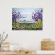 De uma pintura original em acrílicas de Yvonne Ayoub, mostrando Skiathos Town na distância entre Judas floridas Roxas e Euphorbia verde limão, no leste da Grécia