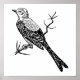 Um pássaro rabo-de-galho, nomeado para a forma forcada da cauda. Este pássaro rabo-de-galinha é desenhado em negrito preto e branco, com detalhes bonitos de penas. Ele está sentado num galho.