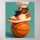 Um design de tênis dinâmico e colorido com contrastes ousados em matiz, balanceado sobre uma bola de basquete. A paleta de cores vívidas e o estilo moderno fazem dessa imagem uma peça sobressalente para entusiastas de tênis e amantes de roupas.