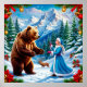 Uma paisagem de inverno mágica com uma donzela de neve vestida de vestido azul interagindo com uma cerveja. Montanhas cobertas de neve e decorações festivas fortalecem a atmosfera sazonal e pacífica.