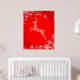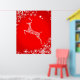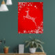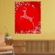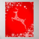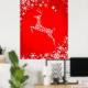 Flocos de neve brancos e uma rena em um fundo vermelho brilhante