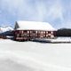 A Casa de Barcos do Lago Maligno, coberta de neve. Cercado por neve fresca intocada. Atrás dos barcos, há o pico de Leah e Samson. O lago completamente coberto de neve.