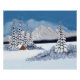 Um poster com uma bela cena de inverno, incluindo montanhas de neve, cabana rústica e neve coberta por vergreens. Arte original por W.B.