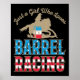 Presente de corrida de barril para cowgirl racer em cores vermelho, branco e azul patrióticas. Perfeito para o amante de corridas de barril ou cavaleiro equestre que cavalga o barril de cavalo em rodeio ou em espetáculo ocidental