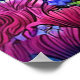 Uma vibrante cena litorânea com um sol brilhante iluminando as ondas do oceano. O céu é um azul brilhante adornado com nuvens cor-de-rosa fluffy, enquanto flores coloridas florescem ao longo da costa, aumentando a atmosfera viva.