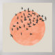 Um bando de pássaros silenciado em frente a um sol avermelhado sobre um fundo bege.