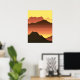 Poster no retrô, montanhas do deserto minimalistas no pôr do sol, em tons de laranja de ferrugem profunda, ouro amarelo e marrom