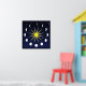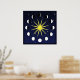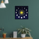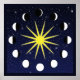 As fases da lua rodeiam um sol brilhante sobre um fundo estrelado