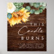 Este pôster do girassol country ousado | vela de madeira que queima é perfeito para o seu casamento simples e clássico boho de verão no quintal do celeiro. O design apresenta um buquê de girassóis amarelos dourados em aquarela vintage e laranja rústico, folhagem de eucalipto verde salvia moderna e elegante, e uma rosa marfim branca. O design é ideal para um casamento casual ao ar livre com folhagem de outono minimalista. Por favor, sinta-se à vontade para entrar em contato conosco com qualquer dúvida sobre o design do produto; votos de felicidade!