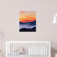 Fotografia paisagística de um atordoante pôr do sol a arder com nevoeiro no vale criando camadas de colinas.