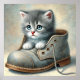 Esta trabalho de arte retrata uma cena alarmante de uma gatinha de cinza enfeitada dentro a calçado de couro vestido. Os grandes olhos azuis do gatinho parecem segurar uma pitada de curiosidade e talvez um toque de solidão. O contraste entre o gatinho minúsculo e o calçado grande cria uma sensação de admiração e adiciona ao encanto da imagem.