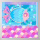 Uma ilustração vibrante e caprichosa que apresenta um peixe-abstrato colorido com padrões intrincados, colocado contra um pano de fundo com temática aquática. As escamas dos peixes são minuciosamente detalhadas com designs geométricos, e a imagem é caracterizada por um uso lúdico e criativo de formas e cores.