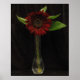 Esta elegante poster apresenta um adorável girassol vermelho solteiro num vaso simples com algumas folhas verdes. O fundo é um tecido de veludo preto profundo.