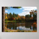 Este adorável poster de viagens de arte mostra uma jovem sentada e sonhando no cais na beira de um grande lago em Nova Inglaterra. O outono está no ar. A água está rodeada de árvores em lindas cores folícolas de amarelo, verde, vermelho, laranja e ouro. O céu azul tem nuvens brancas esvoaçadas e tudo isso está refletido na água. O tronco de uma grande árvore de pínus define o lado esquerdo. O brilho do sol se reflete em seu cabelo vermelho.