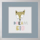 Adorável arte popular em estilo escandinavo tanto no gráfico da raposa doce quanto nas letras que escrevem SONHE GRANDES com fundo cinza