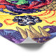 Uma ilustração surreal e vibrante com o rosto de uma mulher. Seu cabelo é enfeitado com cogumelos, flores e outros elementos naturais, enquanto seu rosto é rodeado por padrões, olhos e bolhas giratórias.