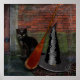 Pyewacket é um gato mágico porque seu dono é uma bruxa! Adorável gato negro, vassoura de bruxa e chapéu nesta cena de Halloween! Arte de Cheryl Lawhon