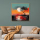 Esta obra de arte atmosférica captura um momento tranquilo de solidão sob um pôr do sol radiante. Uma figura solitária está à beira da água ao lado de uma árvore açoitada pelo vento, recortada contra um vasto céu pintado em tons quentes de laranja queimada, vermelho coral e dourado suave. O sol enorme pende baixo no horizonte, sua luz refletida na superfície tranquila do lago, criando um espelho onírico de cor e emoção.