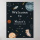 Cute space themed kids birthday welcome poster featuring playful astronaut, planet and star illustrations paired with fun, stylish typography on different color backgrounds. You can find more matching items from this collection in our store.