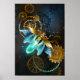 Barbeiro véu com asas transparentes azuis e lâmpada verde sobre fundo vestido, marrom, texturizado. Estilo Steampunk.