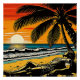 A.I.I. criada interpretação contemporânea de uma figura solitária está se reclinando sob a sombra de uma palmeira, olhando para um pôr do sol cênico da praia onde ele foi encalhado devido a um naufrágio. O céu está cheio de tons vibrantes de laranja e vermelho, e o mar calmo reflete o sol enquanto encontra o horizonte com um veleiro solitário à distância.