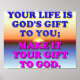 SUA VIDA É O PRESENTE DE DEUS PARA VOCÊ; FAÇA DELA O SEU PRESENTE PARA DEUS. Esta imagem colorida é uma fonte de inspiração e encorajamento excelente para todos os cristãos que acreditam em Deus. Diz simplesmente que tal como Deus nos deu a dádiva da vida, devemos viver as nossas vidas por ele. Porque afinal, ele é o único que pode criar a vida! Peça sua cópia do poster com uma bela imagem hoje!