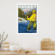 poster de viagens vintage de Suecia mostrando um pescador ao ar livre.