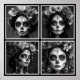 Bold black and white sugar skull artwork with intricate detail and timeless style.