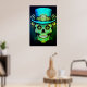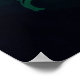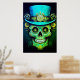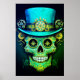 Sugar Skull image in blue and green, with a black background, on a wall poster.