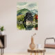 This serene watercolor-style painting features a majestic Japanese castle nestled beside a tranquil lake, surrounded by lush summer foliage. Soft green mountains rise in the background, while vibrant touches of red and gold hint at seasonal change. The castle’s elegant multi-tiered rooftops reflect beautifully in the still water below, creating a peaceful, immersive landscape. Perfect for lovers of Japanese architecture, nature scenes, and calming wall art.