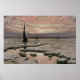 Artista Birge Harrison. Pinks e roças de um pôr do sol de inverno refletem-se e difundem-se sobre gelo quebrado com barcos escuros presos pela água congelada