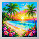 Margem tropical vibrante com um pôr do sol espantoso, ondas de turquesa e flores exuberantes em cores vivas. Perfeito para evocar relaxamento, férias de verão, e beleza natural serena.
