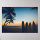 Este design apresenta uma fotografia de um pôr do sol de praia tropical com pranchas de surfe e palmeiras em primeiro plano. #surf #praia #tropical #paraíso