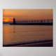 O pôr do sol no cais do farol de South Haven no lago Michigan.