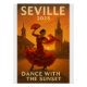 design do poster de viagens com o título "Sevilha 2025 - Dança com o pôr do sol", representando um dançarino flamenco a atuar em frente à arquitetura histórica de Sevilha no pôr do sol