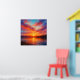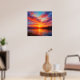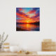 Artwork of a sunset over a calm lake. This artwork features vivid, painterly textures and a brilliant gradient sky ranging from deep purple to bright gold. The reflection on the water creates a peaceful, mesmerizing effect. With a symphony of fiery oranges, deep magentas, and calming indigos, the sky comes alive through dynamic, impasto-style brushstrokes. The vibrant colors are mirrored perfectly in the tranquil waters below, creating a sense of infinite depth and serenity. Delicate silhouettes of trees and shoreline grasses ground the composition, reminding us of the quiet beauty of nature. Perfect for a living room centerpiece or a bedroom sanctuary, this piece invites you to pause, breathe, and lose yourself in the glow of the setting sun.