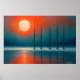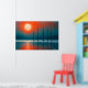 Tall trees stand silhouetted against a vibrant sunset, their reflections mirrored in the tranquil water below. The strong contrast between the warm sun and the cool blue tones creates a striking visual effect.