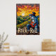 Um trabalho de arte imaginativo representando um tubarão azul, vestindo um chapéu e óculos de sol na moda, lançando uma "serenata do pôr do sol" em uma guitarra elétrica de um ponto de vista rochoso. A cena desdobra-se sobre colinas e árvores verdejantes, todas banhadas no brilho quente de um pôr do sol. A espessa e expressiva escova adiciona uma sensação táctil e dinâmica a toda a composição, enfatizando a energia "ROCK and ROLL".