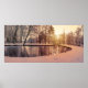 Sunset sobre parque com lago gelado pequeno e coberto de neve