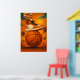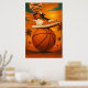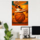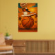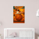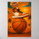Um tênis cor de laranja e branco que se apanha aos olhos balanceado numa bola de basquete, colocado contra um fundo de sol vibrante com palmeiras e nuvens. Esta imagem captura a essência do estilo de rua tropical de retorno com uma reviravolta esportiva.