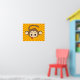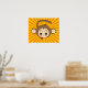 Uma ilustração de um rosto de macaco com bochechas azuis e sua língua saindo. Que bonito e kawaii. O fundo é um padrão alegre amarelo e laranja com raios solares a explodir à volta do fazer macaco que ele parece super poderoso.