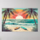 Impressão de poster de pranchas de surfe na praia com o pôr do sol no fundo. Conteúdo Genérico
