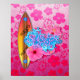 Design de surfista com salpicos de água, prancha de surfe com tartarugas havaianas Honu e flores de hibisco rosa. Padrão havaiano rosa de fundo das tartarugas Honu e flores de hibisco.