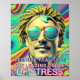 A multi-colored poster with the text "SURREAL" reflected in the sunglasses. The text " BECAUSE REALITY IS THE LEADING CAUSE OF STRESS," is written at the bottom. This vibrant, colorful art is reminiscent of the seventies.