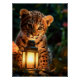 Ein niedliches Leopardenjunges im Dschungel. Ein Laterne die vor ihm steht beleuchtet ihn und seine nahe Umgebung.